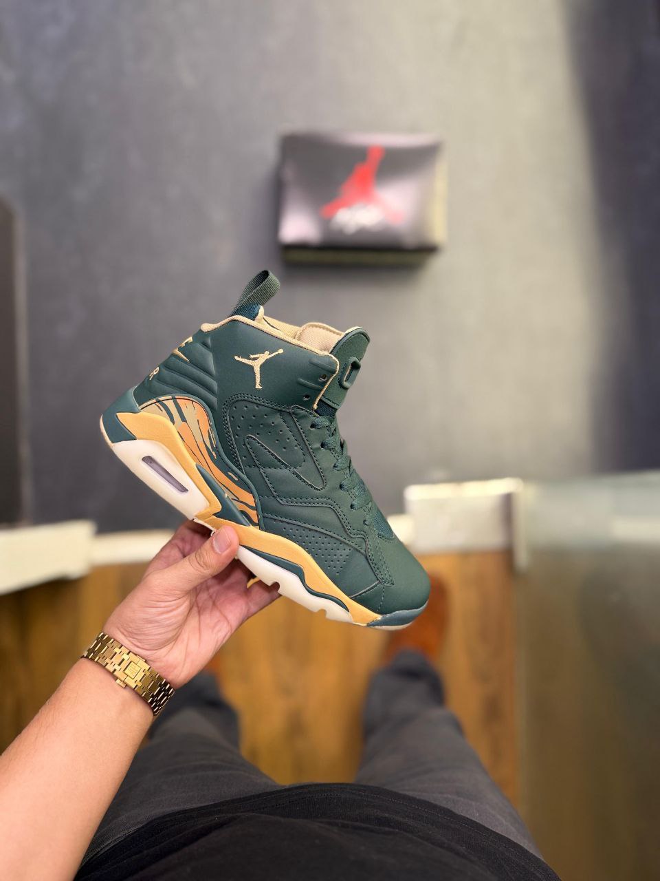 Step up your sneaker game with the eye-catching **Air Jordan Jumpman MVP in Green** with gold accents. These high-top sneakers feature a bold, athletic design and premium construction that delivers a look next to original store quality. Perfect for sneaker enthusiasts looking for high-end style and superior comfort. **Key Features & Quality:** * **Striking Colorway:** Deep Green with elegant Gold/Yellow accents, offering a premium and unique aesthetic. * **Showroom Quality:** Crafted with top-tier materials for a luxurious look and feel, delivering a finish next to original store standards. * **Iconic Design:** Features the classic high-top silhouette with superior ankle support and a durable rubber sole. * **Free Shipping:** Get these statement sneakers delivered right to your door with **FREE SHIPPING**. **What's Included:** * New Pair of Air Jordan Jumpman MVP Green Sneakers * Securely packaged to ensure they arrive in perfect condition.
